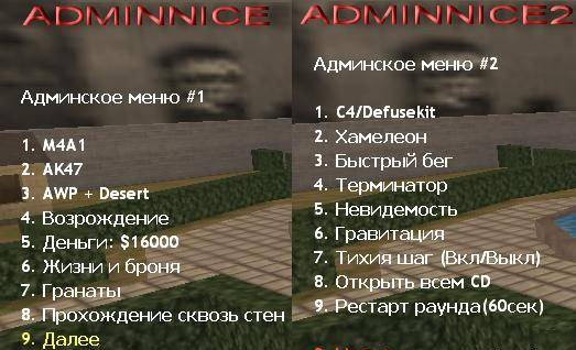 Команды: пишем в консоле adminnice или биндем (bind F4 adminnice)